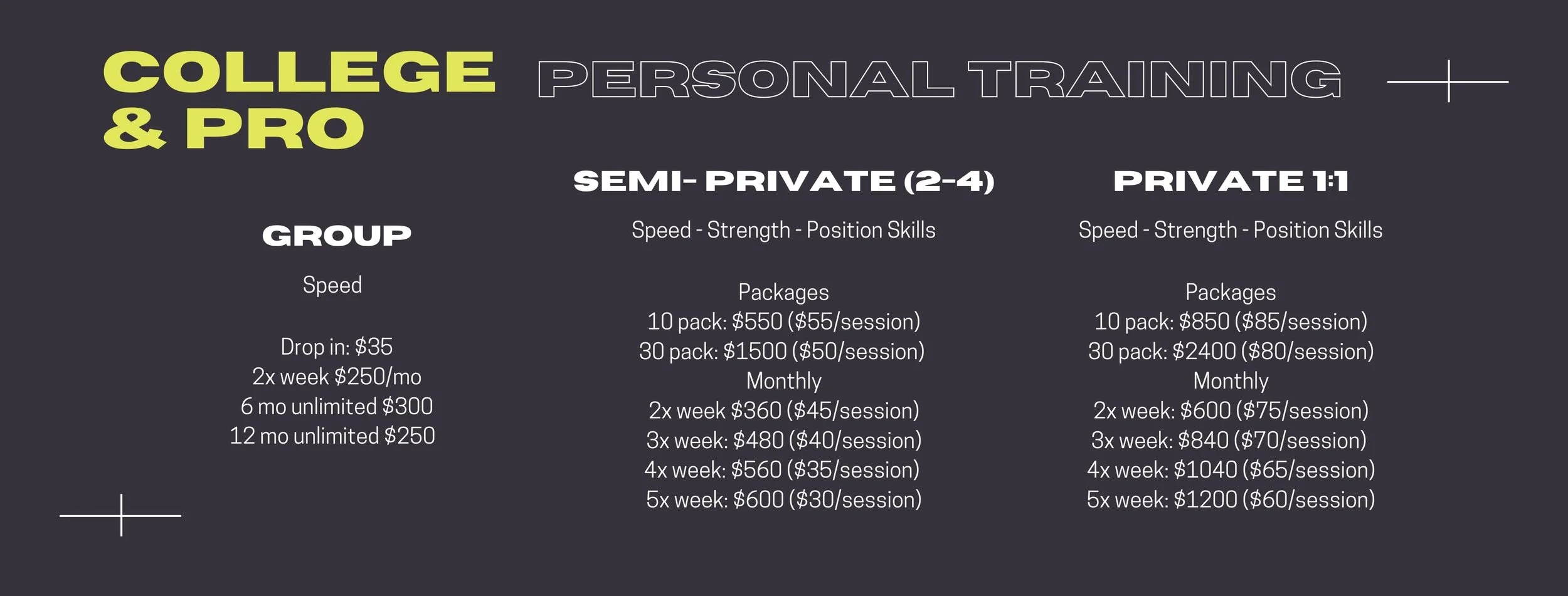 Take your athletes game to the NEXT LEVEL by training with our elite CSCS certified strength and conditioning staff. The coaches programming your workouts have masters degrees in applicable fields and have experience at the highest level programing and training NFL, CFL, and college athletes focusing on their own personal goals and specific sport position.